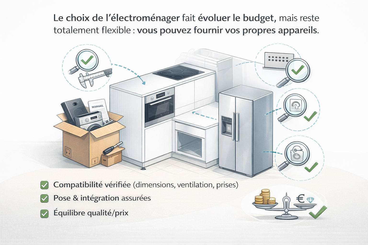 Le choix de l’électroménager fait évoluer le budget (marques, performances, options), mais il reste totalement flexible : vous pouvez fournir vos propres appareils. Dans ce cas, nous vérifions la compatibilité (dimensions, ventilation, prises) et nous assurons la pose et l’intégration pour un résultat propre et sécurisé, tout en gardant le meilleur équilibre qualité/prix.