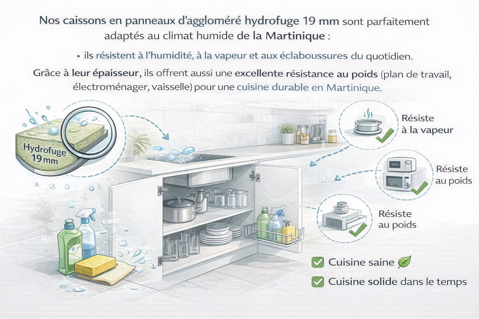 Nos caissons en panneaux d’aggloméré hydrofuge 19 mm sont parfaitement adaptés au climat humide de la Martinique : ils résistent à l’humidité, à la vapeur et aux éclaboussures du quotidien.