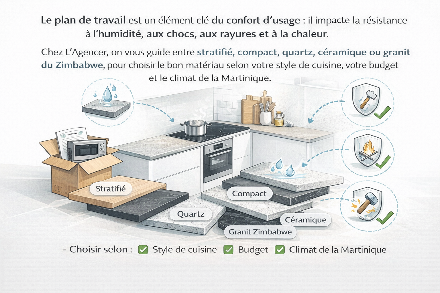 Chez Lagencer, on vous guide entre stratifié, compact, quartz, céramique ou granit du Zimbabwe, pour choisir le bon matériau selon votre style de cuisine, votre budget et le climat de la Martinique.